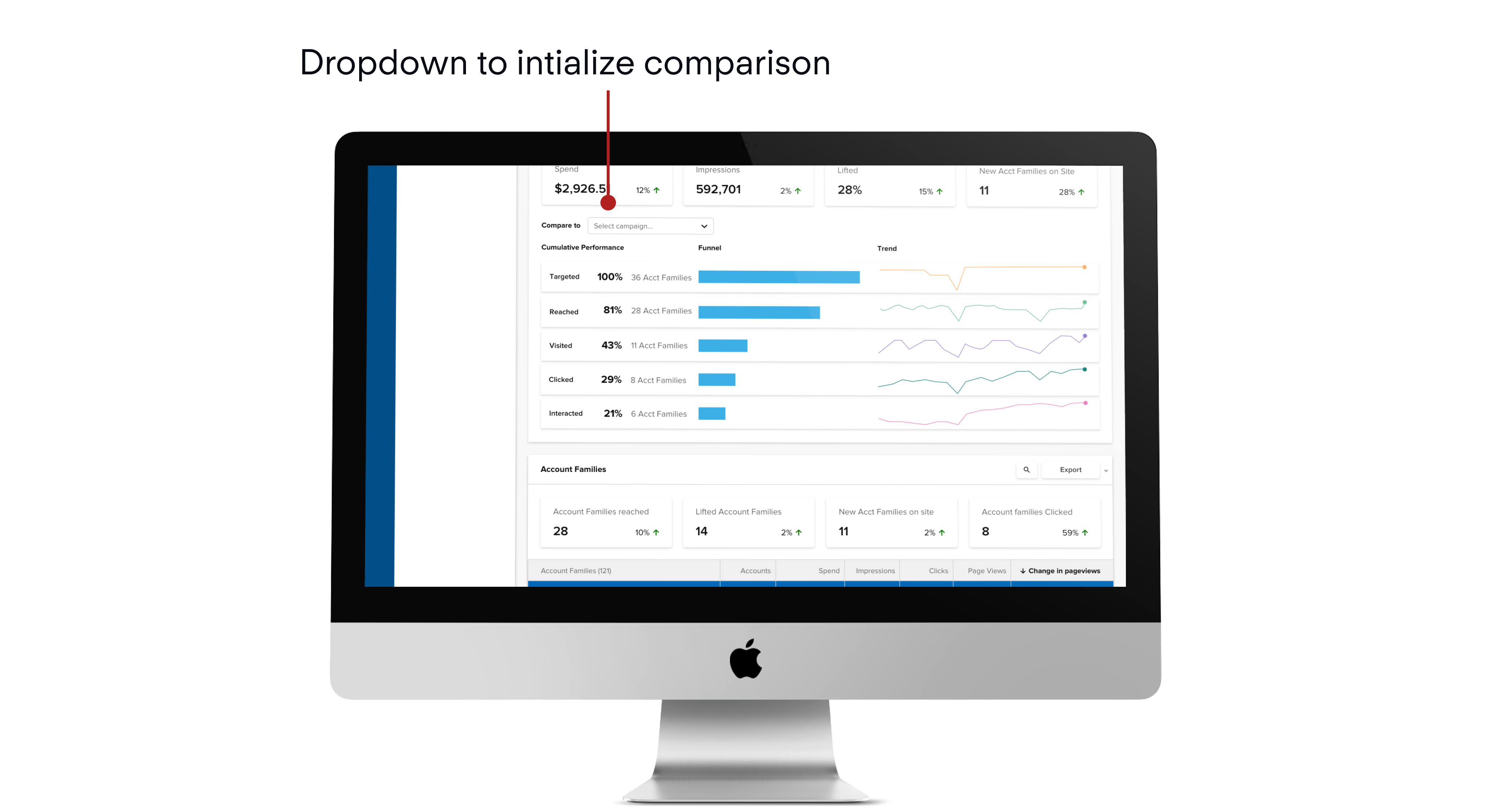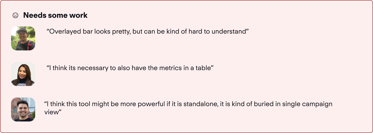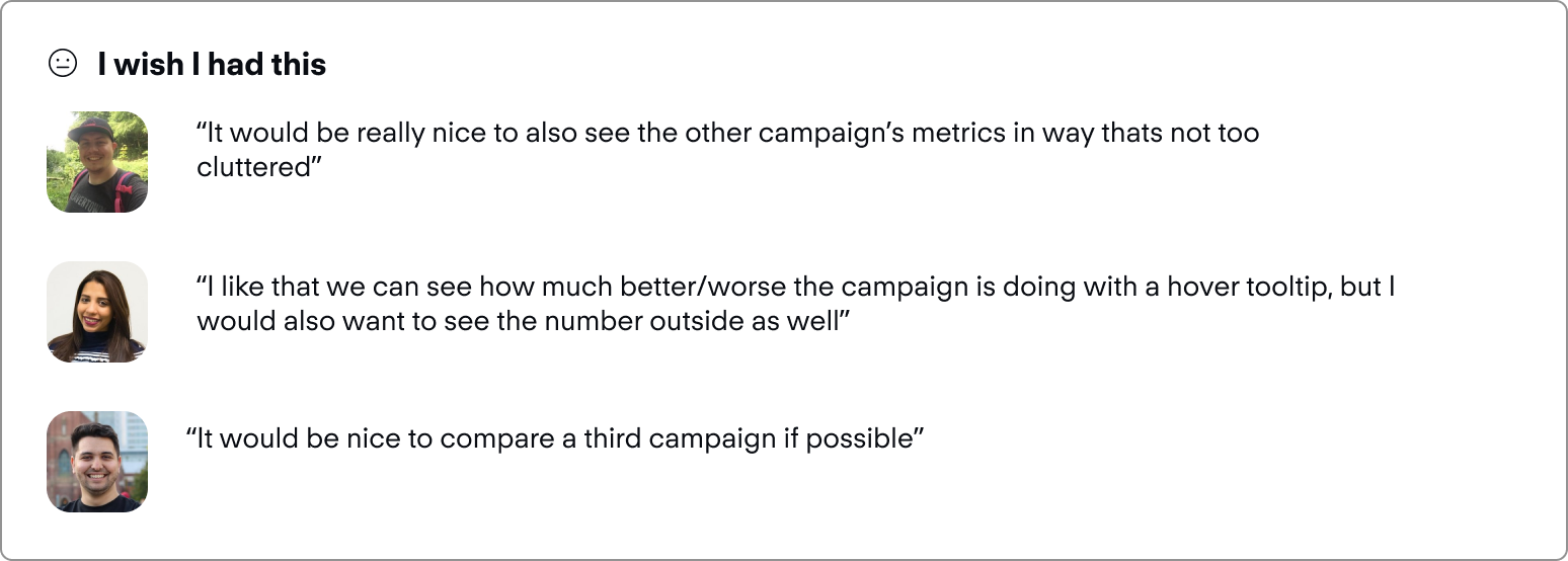 A followup on this project that would be a v2 improvement would be to show campaign metrics in a small expandable table below the comparison. This was heavily asked for during our user testing sessions for ease of access. The information is actually baked into the tooltips in the chart, but would be easier to parse with a table.