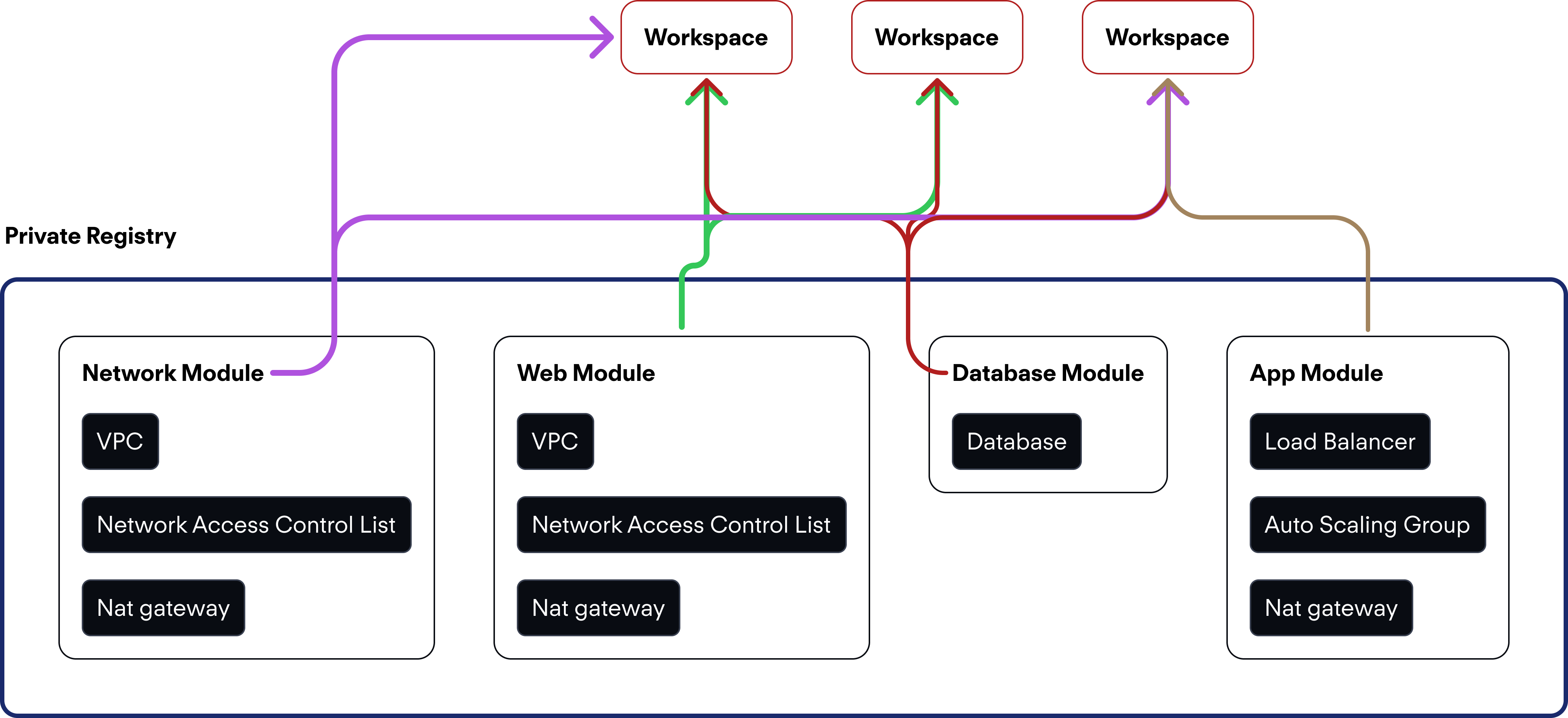 Terraform Cloud has the concept of software modules as a foundational element for managing cloud infrastructure. Modules are reusable, self-contained packages of Terraform configurations that encapsulate a set of resources. They help organize and manage infrastructure as code by promoting reusability and maintainability. You can define a module once and then use it many times, which helps for the overall notion of DRY (Do not Repeat Yourself) code. Modules come in two core flavors - public, which are downloaded from the Terraform registry, and private, which are managed by internal organizations.