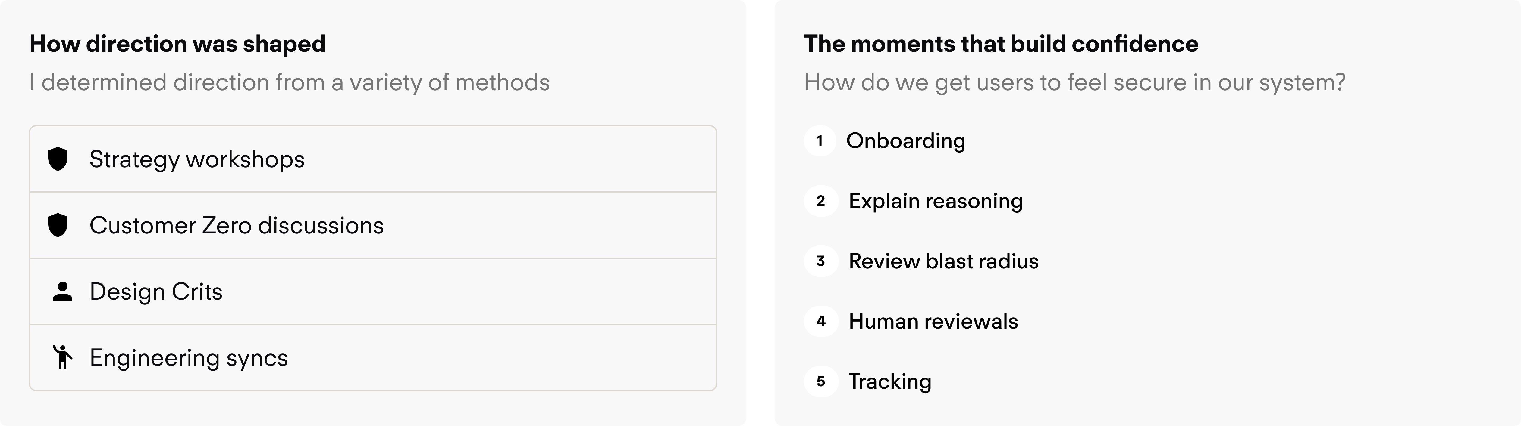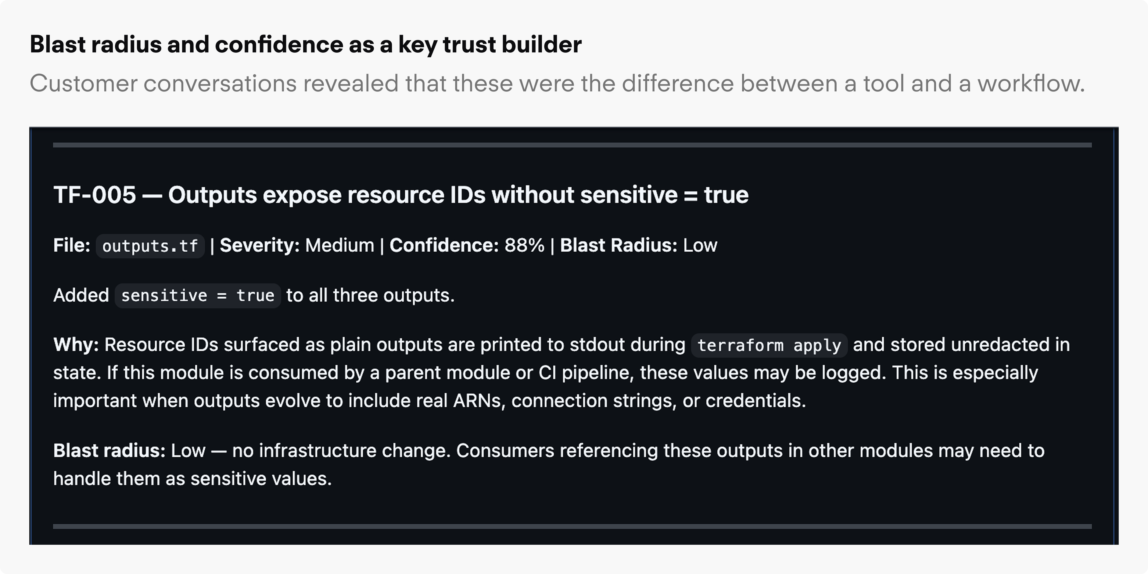 Decision: Confidence signal, rule context, blast radius, and a history of prior PRs and actions were not extra polish; they were the product. Treated each as a required surface, not a nice-to-have.