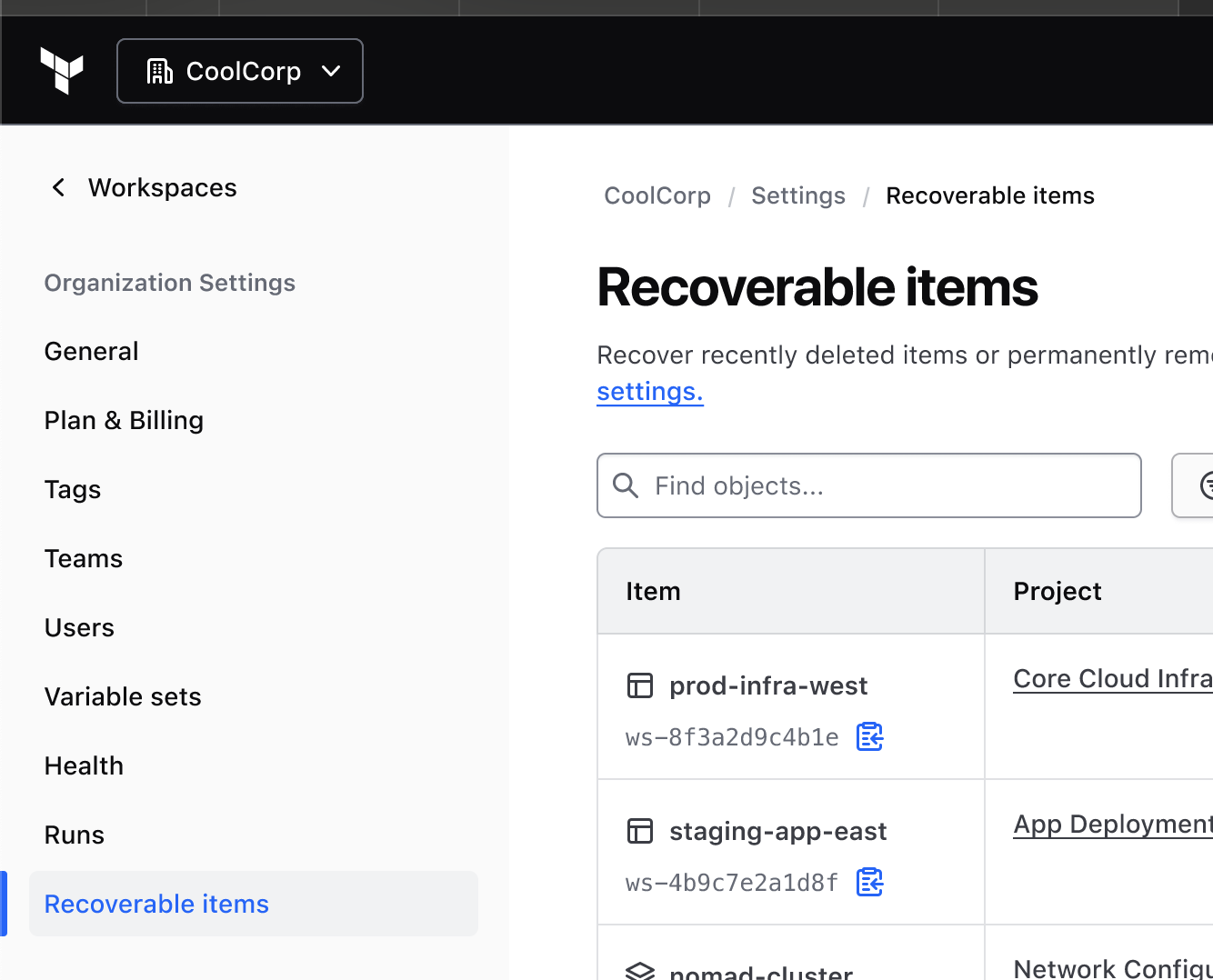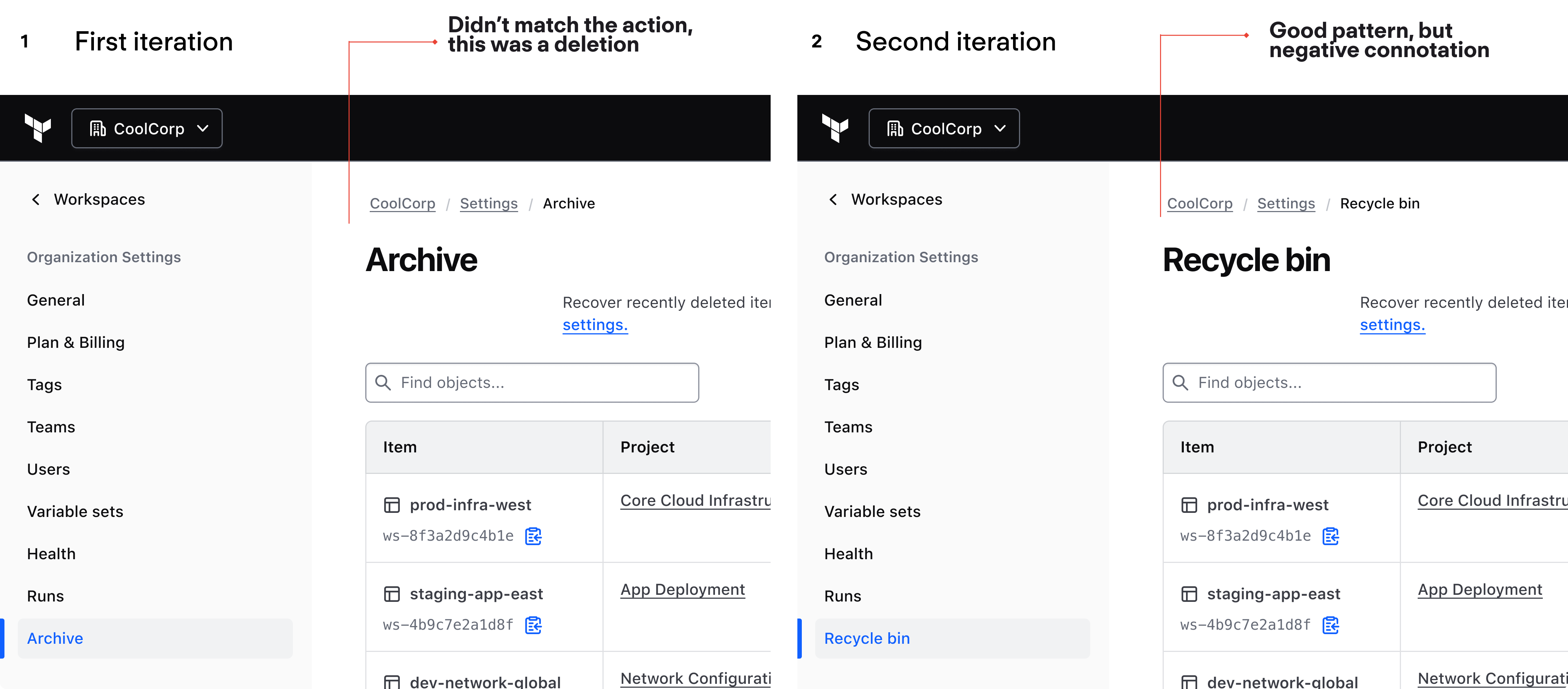 Challenge: Naming it "Workspace Recovery" would lock the feature to a single object type, requiring a second IA change when stacks and other resources needed the same capability.