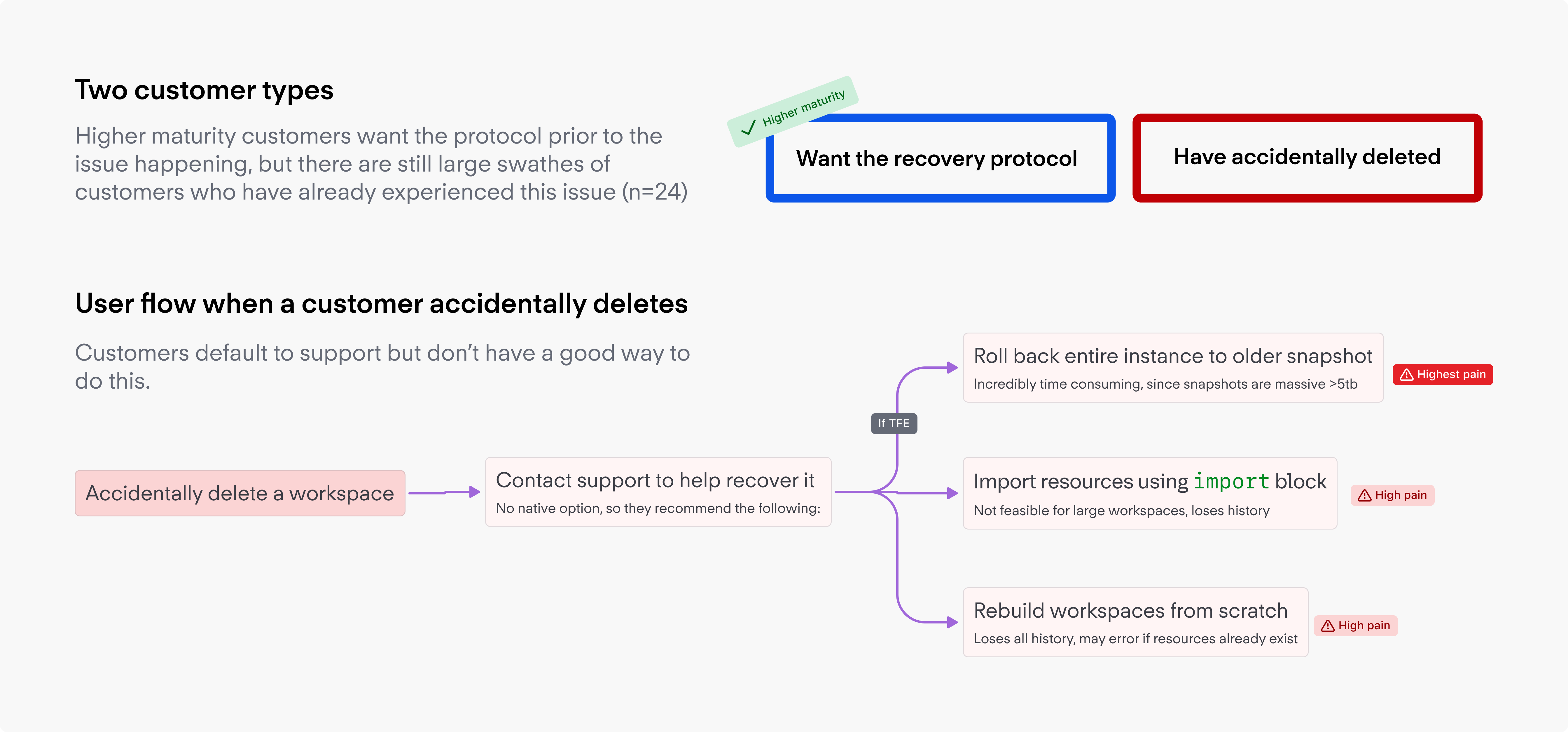 That mismatch shaped the whole problem. Recovery had to fit the reality of enterprise operations, not just the UI. I partnered with my PM to frame the work around three questions: how accidental deletion actually happened, what a believable recovery path should bring back, and how customers were already trying to protect themselves from this risk.